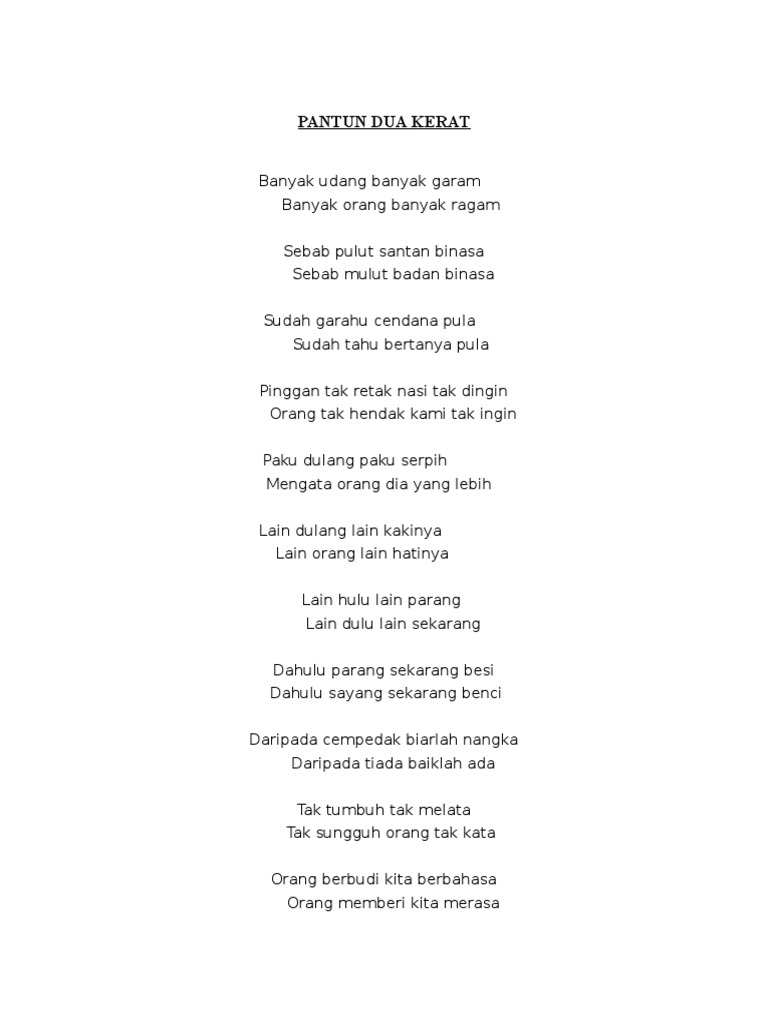 Komsas Bahasa Melayu Tingkatan 1 2 3. Pantun dalam bentuk pantun 2 kerat 4 kerat 6 ataupun 10 kerat adalah sebahagian daripada kesenian bahasa dalam budaya masyarakat Nusantara samada untuk adat istiadat nasihat pendidikan gurauan hiburan majlis keramaian dan juga dalam perbualan harianPerbezaan pantun dengan bahasa berirama dan puisi Melayu lain ialah dari segi bentuk lenggok irama. Teks dalam genre ini disusun sedemikian rupa untuk memudahkan murid mengenal pasti menghayati dan seterusnya menimbulkan minat terhadap warisan budaya Melayu yang.